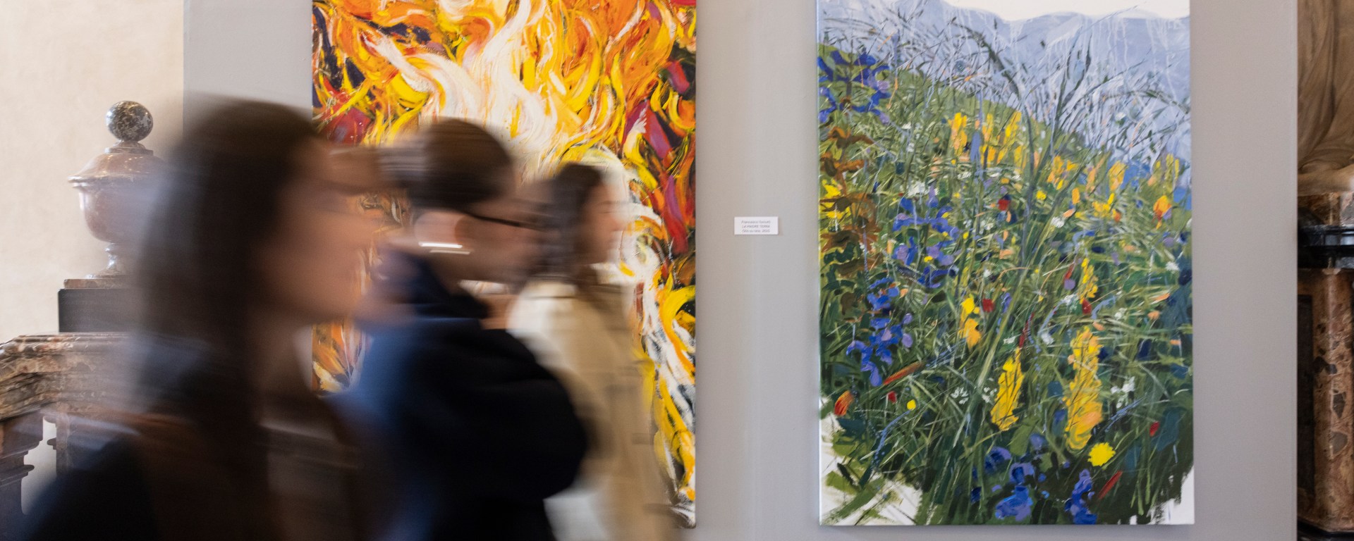 All’acqua, che è “multo utile et humile, et pretiosa et casta”, segue il fuoco, che ha il potere di illuminare la notte e le sue lingue che escono dal buio sono sulla tela baldanzose e forti. Bruciano come la passione del santo e sciolgono lo stesso pigmento della pittura che sgocciola all’incontrario, dal sotto in su.
